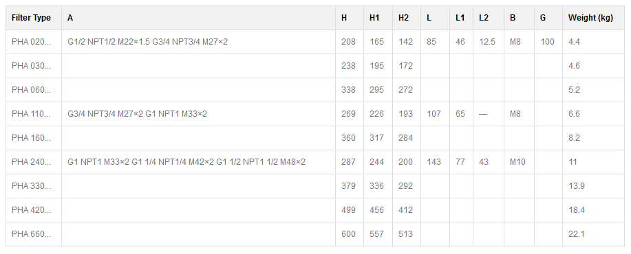 | PHA 020... | G1/2 NPT1/2 M22×1.5 G3/4 NPT3/4 M27×2 | 208 | 165 | 142 | 85 | 46 | 12.5 | M8 | 100 | 4.4 |