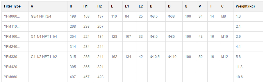 | YPM060... | G3/4 NPT3/4 | 198 | 168 | 137 | 110 | 84 | 25 | Φ8.5 | Φ68 | 100 | 34 | 14 | M8 | 1.3 |