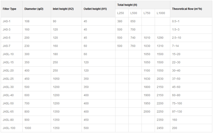 | Filter Type | Diameter (φD) | Inlet height (H2) | Outlet height (H1) | Total height (H) | Theoretical flow (m³/h) | |||